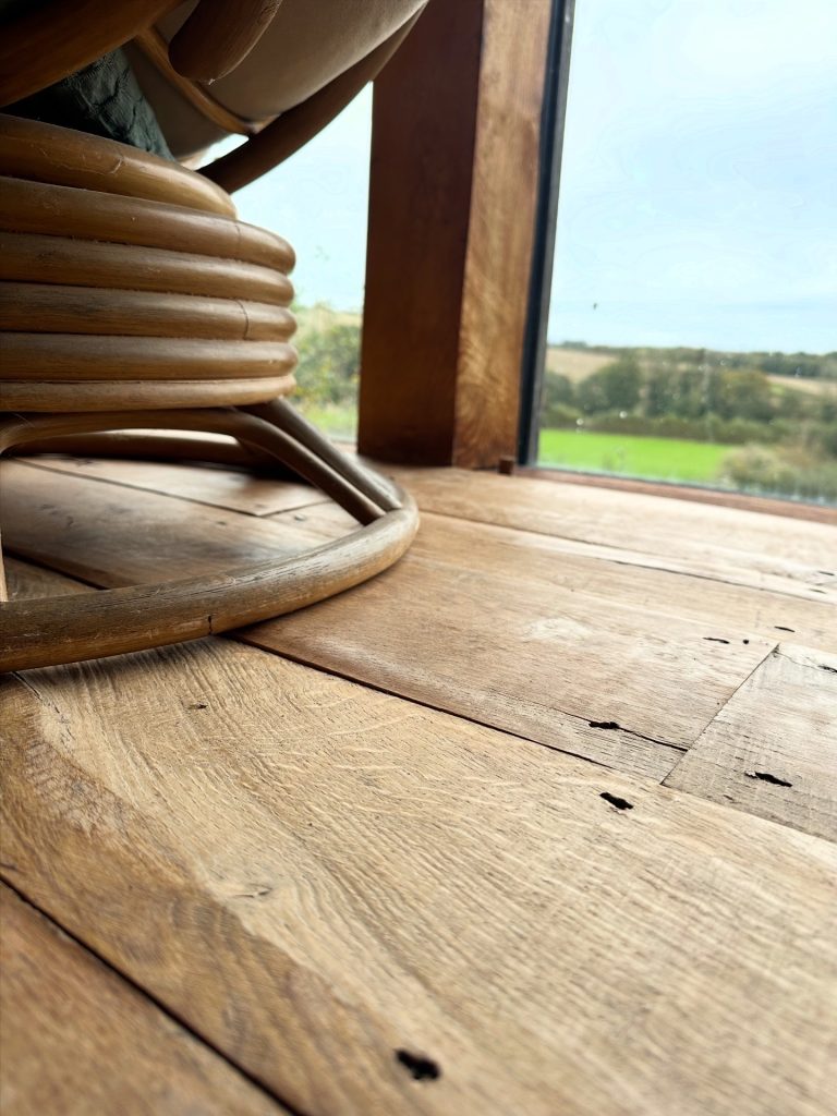 The subtle darkening and variations that occur when water interacts with the wood create organic patterns that enhance rather than detract from the floor’s appearance. These marks settle into the natural undulations of the oak, becoming part of the floor’s story rather than blemishes to be hidden. We often get asked about the use of this flooring in bathrooms- its forgiving nature means that it’s the perfect wood flooring for bathrooms. Whether you’re considering combining the wood floor with a copper bath or not, it’s a floor that keeps on giving and looks better with time. We can give you advise as to how to finish the floor when using it in ‘damper environments’ like a bathroom or kitchen, so just message our friendly office team for more help.